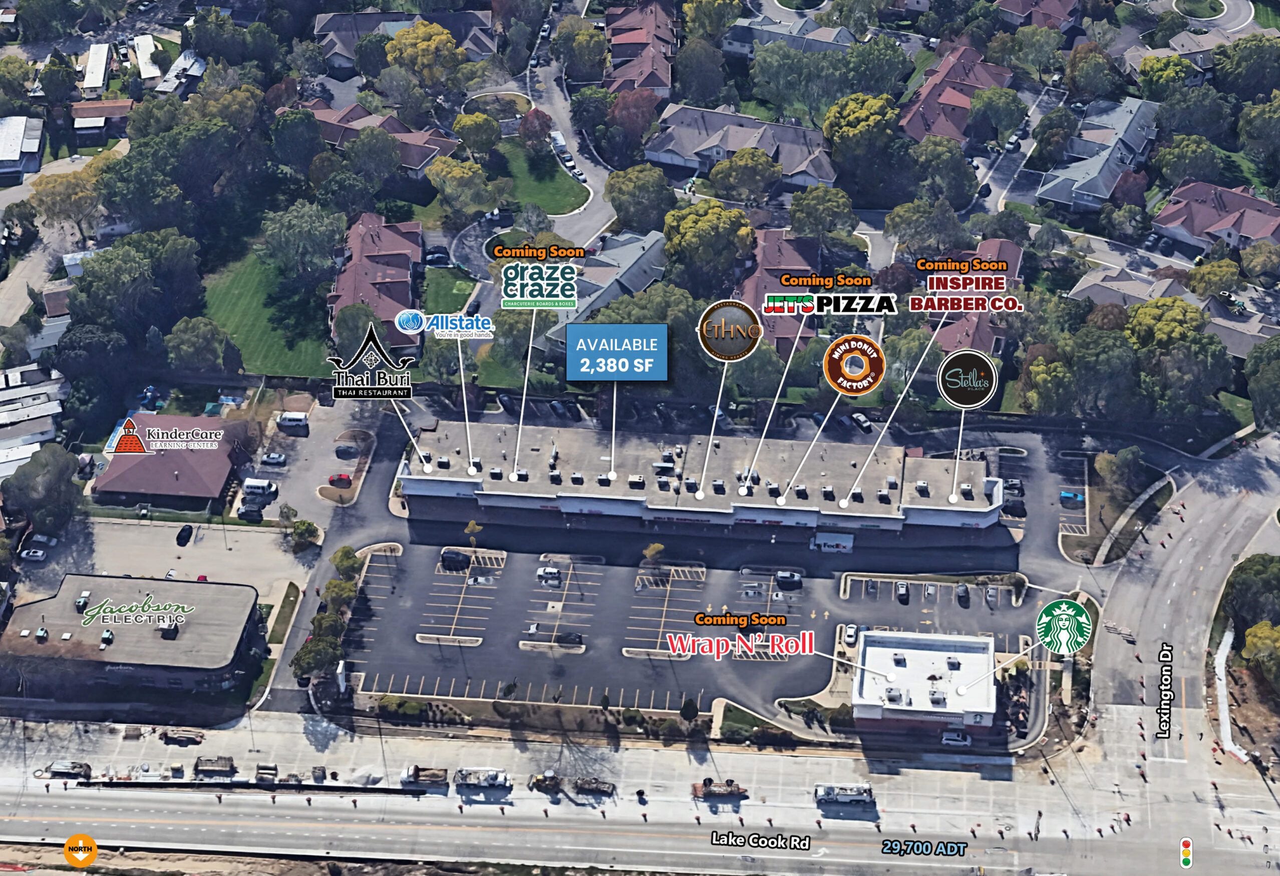 High exposure location at stoplight intersection along Lake Cook Road (29,700 ADT).